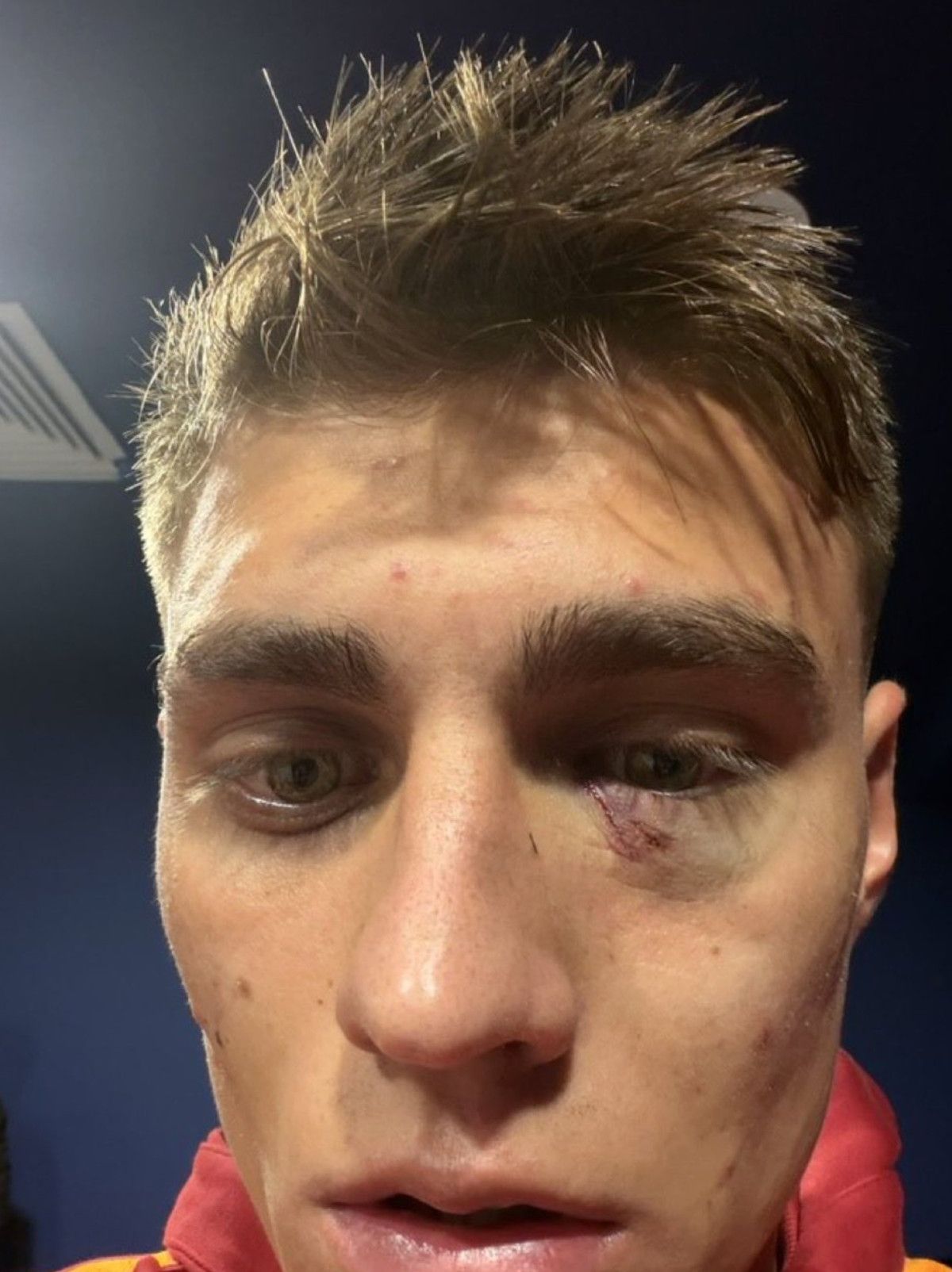 Galatasaray’ın gol sevinci sırasında tribünden atılan bir yabancı madde futbolcu Kazımcan Karataş’ı yaraladı.