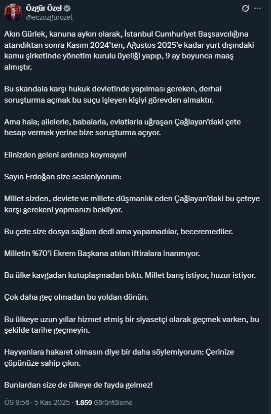 Cumhurbaşkanı ve AKP Genel Başkanı Recep Tayyip Erdoğan, CHP lideri Özgür Özel‘in dün öne sürdüğü Akın Gürlek iddialarına ilişkin olarak göndermede bulundu. Özel’e “ana muhalefet lideri” diye seslenerek tepki gösteren “Ortada zihni ile dili arasındaki bağı tamamen kopmuş, ağzından çıkanı kulağı duymayan zavallı bir şahıs var. Bu zat gün aşırı söylediği yalanlarla önüne gelene attığı iftiralarla, meydanlarda savurduğu hakaretlerle giderek saldırgan hale geliyor. Yerel yönetimleri ahtapot gibi saran suç örgütlerinin yolsuzlukları ortaya dönükdükçe bu zat da çirkinleşiyor” dedi.