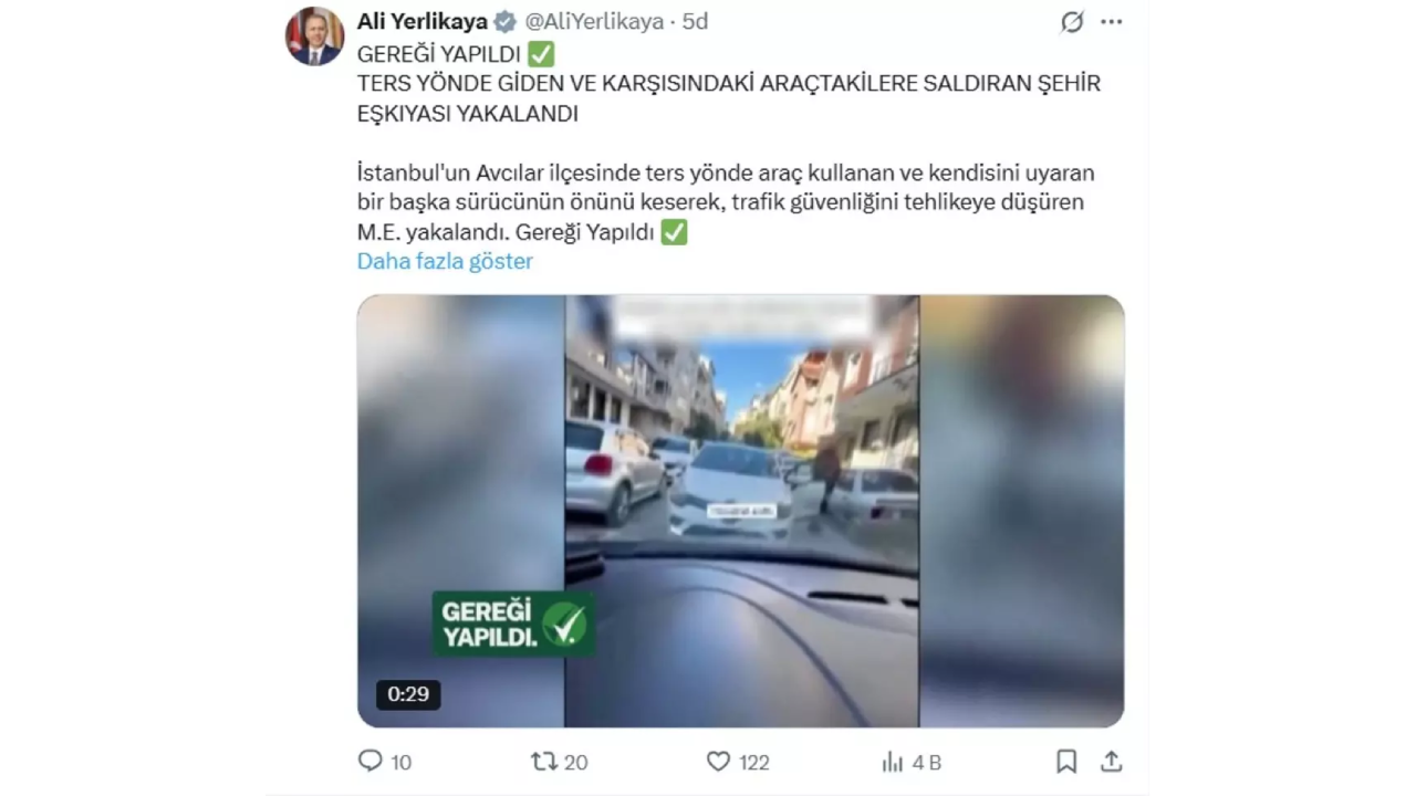 Avcılar Denizköşkler Mahallesi’nde meydana gelen olayda, tek yön olan Sülün Sokak’ta ilerleyen Mustafa Morbel, ters yönden gelen sürücüye geri gitmesi için uyarıda bulunmuştu. Sürücü yol ortasında dururken, görüntülendiğini fark ederek araçtan inmişti. “Niye görüntü alıyorsun” diyerek tepki gösteren sürücü, ters yön uyarısında bulunan Mustafa Morbel’e saldırmıştı. Bakan Yerlikaya o magandanın cezasız kalmadığını açıkladı.
