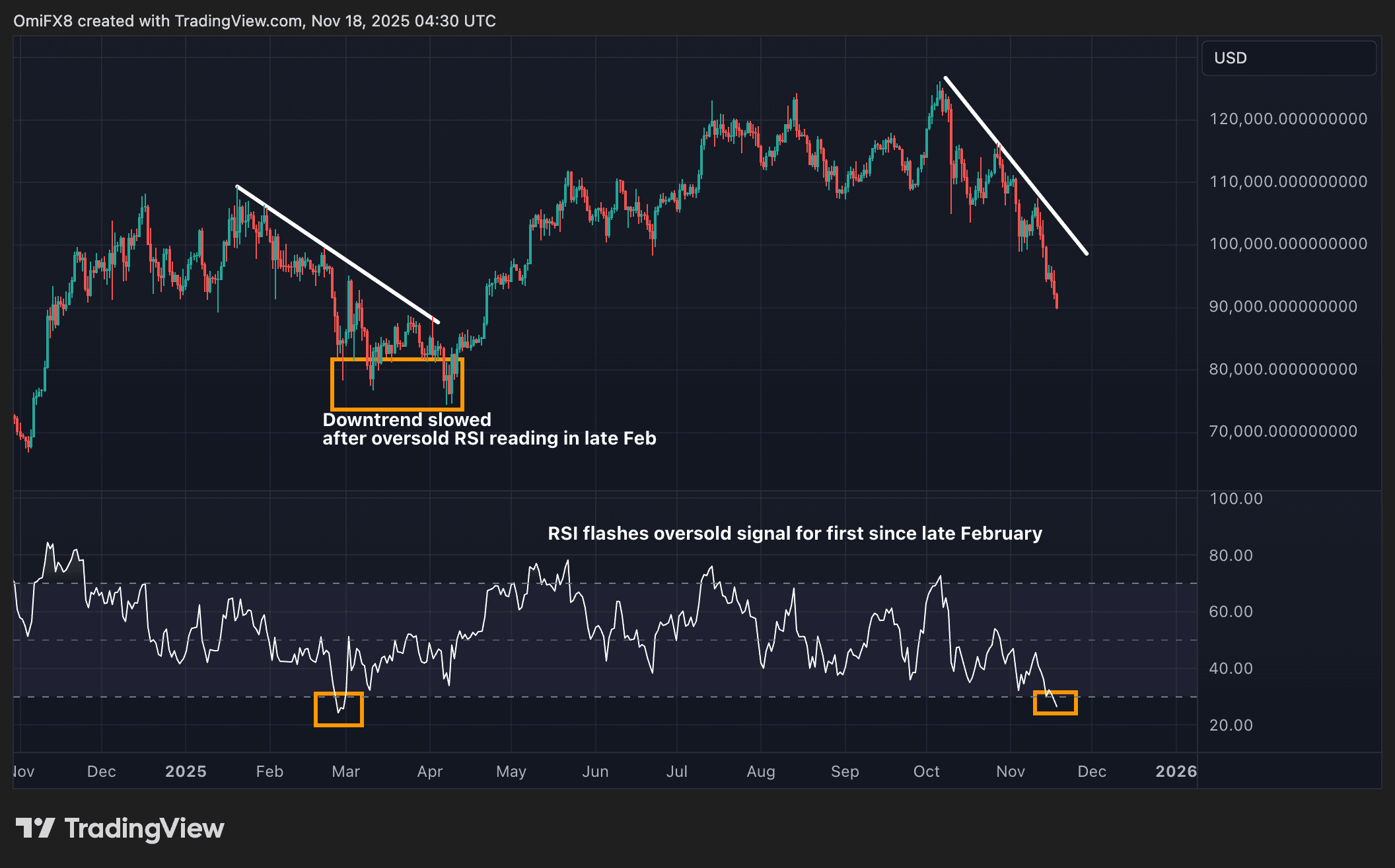 BTC’s price fell below $90,000 early Tuesday, down 28% from the record high of over $126,000 reached early last month. With that the 14-day relative strength index (RSI) — a widely followed measure of price momentum — has dipped below 30, signaling an oversold condition. This means BTC’s ongoing slide has been sharp enough to invite a pause or a potential rebound.